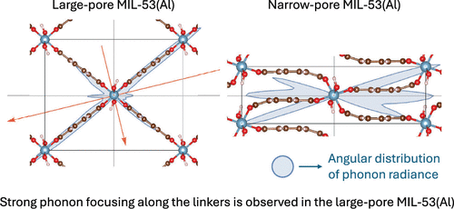 The metal–organic framework (MOF) MIL-53(Al) has a framework geometry with an unconstrained wine-rack mode that enables it to concertina between large-pore (lp) and narrow-pore (np) structures either under pressure or with the uptake of adsorbates. This article presents the results of equilibrium classical molecular dynamics simulations that show that, in these breathing MOFs, the thermal conductivity─an important property for gas sorption in high-surface-area materials─also changes between open and closed conformations. The observed conductivity change differs significantly from that of a network of resistors undergoing the same geometric change. The dispersion relations and phonon group velocities in both the lp and np configurations of MIL-53(Al) are computed using self-consistent-charge density functional-based tight binding (SCC-DFTB). These exhibit rattler-mode behavior and phonon-focusing effects. To provide a mechanistic understanding of these features, a reduced order model of the MOF architecture is presented that captures the lattice dynamics and the band avoidance of acoustic and rattler phonon bands. Moreover, it is shown that the observed phonon focusing is caused by band bending from the rattler modes.