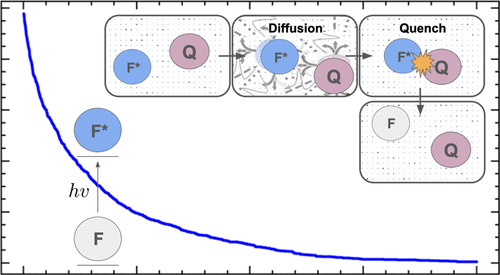 A computational method to simulate bimolecular quenching reactions using coarse-grained reaction-diffusion dynamics is presented and applied to the quenching of molecular photosensitizers in solution. The simulations describe photoinduced reactions involving explicit excited states of light-harvesting species together with intrinsic deactivation, as well as collision quenching from separate quencher species. The simulation methodology is applied to time-resolved quenching of light-harvesting Fe(III) complexes in electron-donating solvents as a prototype system for reaction-diffusion dynamics of experimental interest over a wide range of quencher concentrations. The results show clear signatures for the transition from classical diffusion-limited Stern–Volmer dynamics to close-contact quencher-photosensitizer interactions at high quencher concentrations, and the simulations are used to elucidate physically realistic photosensitizer-quenching collision interaction parameters for photoinduced dynamics beyond the classical Stern–Volmer model. The simulation method provides the means to directly model and analyze system kinetics and dynamics beyond standard theoretical equations, opening up significant opportunities to simulate a broad range of reactions in solutions.