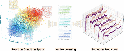 Chemical reaction dynamics, critical to advancing technologies in energy, environment, and materials, can in principle be captured via reactive molecular dynamics (RMD). Time-series machine learning algorithms enable prediction of species evolution information hidden in these simulations, but long-horizon autoregressive accuracy often degrades due to error accumulation, and generating sufficiently large and diverse RMD data sets across operating conditions is computationally expensive. Here, we propose DEAL-TCN (deep-ensemble active learning with temporal convolutional networks), an active-learning framework that effectively disentangles the high-dimensional complexity of reaction dynamics spanning species, time, and operating conditions. It adopts the query-by-committee strategy to select informative conditions and leverages one-dimensional temporal convolutions to capture interspecies and long timescale couplings, enabling efficient modeling and long-term prediction of species evolution. In a prototypical case study of Mo–O–S precursors, DEAL-TCN robustly identifies and accurately predicts the concentration evolution of all involved chemical species across orthogonally designed test sets spanning a broad parameter range (1100–1500 K, 2–6 atm, and a feed ratio of 1/25–1/15). Given only the first 50 ps of each trajectory as input, the model attains a mean prediction error of 4.8% at the picosecond level while maintaining a mean error of 18.2% over the subsequent 0.45 ns, representing improvements of ∼29% and 24% over baseline LSTM and Transformer architectures, respectively. Meanwhile, DEAL-TCN outperforms random sampling in 98.8% of active-learning iterations with the same labeling budget. These results underscore DEAL-TCN’s potential as a scalable and generalizable approach for mechanistic discovery, reaction design, and optimization.