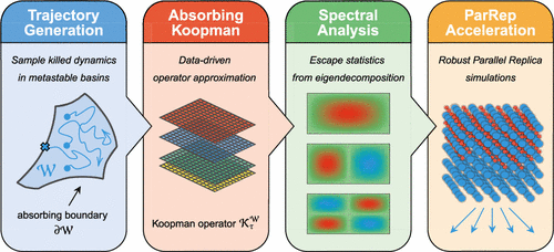 Many physical and biological systems evolve through metastable dynamics characterized by long intervals during which the trajectory remains confined to a small region of the configuration space punctuated by rare but rapid transitions between such regions. Accurately quantifying both the local relaxation and the first-escape behavior from each metastable set is central to many applications including enabling the simulation of long-time dynamics. In this work, we extend well-established data-driven methods for estimating Koopman operators to the setting of quasi-stationary distributions (QSDs) by enforcing absorbing boundary conditions on metastable states. We show that this absorbing Koopman formulation reliably recovers the spectral properties governing relaxation and escape using only short-trajectory data. Finally, we show how these spectral estimates naturally couple with a general parallel-in-time simulation scheme, enabling rigorous and substantial extensions of the time scales accessible to direct simulation of complex metastable systems.