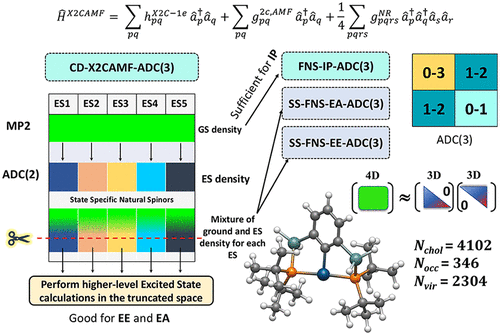 We present an efficient relativistic implementation of algebraic diagrammatic construction (ADC) theory up to the third order for the treatment of electronic ionization potentials (IP), electron affinities (EA), and excitation energies (EE) in heavy-element systems using an exact two-component atomic mean-field (X2CAMF) Hamiltonian. The approach combines Cholesky decomposition (CD) of two-electron integrals with frozen natural spinors (FNS) to significantly reduce the computational cost without compromising accuracy. To improve the description of excited states, we have implemented a state-specific frozen natural spinor (SS-FNS) framework and applied it to both electron affinity and excitation energy calculations. In addition to the standard relativistic ADC(3) method, we investigate a semiempirically scaled variant in which the third-order contribution to the ADC secular matrix is multiplied by a scaling factor (x), denoted as FNS/SS-FNS-[ADC(2)+x(3)]. This [ADC(2)+x(3)] approach shows systematic improvements over conventional ADC(3) in a variety of cases. Substantial computational savings are achieved through the use of FNS and SS-FNS schemes when compared to canonical calculations, resulting in significant speedups for ionization, attachment, and excitation energy computations. The current implementation accurately reproduces the canonical four-component ADC(3) results while significantly reducing computational cost. The efficiency and robustness of the method are demonstrated through applications to medium and large-sized molecular systems, including systems with 70 atoms and over 2600 basis functions.