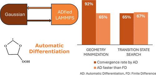 Reaction models are essential for understanding chemical reactions, but modeling them is a time-demanding process. Automated reaction space exploration techniques, such as ChemTraYzer-TAD, can simplify this process. However, finding transition states (TS) remains a hurdle. TS geometries are crucial for calculating reaction rate constants. Quantum mechanical methods are computationally expensive for TS geometry searches, while reactive molecular mechanics, like ReaxFF, offer faster calculations. Accurate TS searches require second derivatives of energy. State-of-the-art ReaxFF implementations can provide these derivatives only through finite differentiation (FD), which introduces noise. Automatic differentiation (AD) can provide more accurate second derivatives. Hence, this work integrates AD into the classical molecular dynamics code LAMMPS for calculations of second derivatives, presenting ADfied LAMMPS. By interfacing ADfied LAMMPS with the Gaussian computational chemistry suite, LMP-Gau is developed, enabling efficient geometry optimization, frequency calculations, and reaction path following for any force field. LMP-Gau demonstrates improved energy minimization for stable molecules in comparison to standard LAMMPS methods. It is also used successfully to find transition states in 1,3-dioxolane oxidation, demonstrating improved convergence with AD compared to FD.