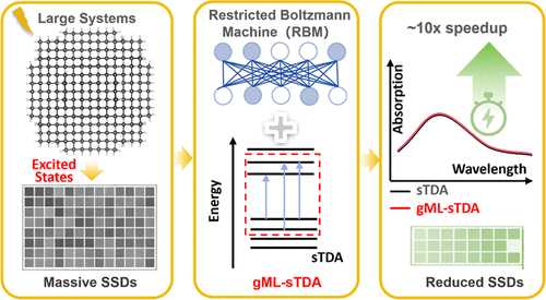 Accurate excited-state electronic-structure calculations for large systems remain challenging due to the prohibitive cost of constructing and screening the configuration space in conventional linear-response approaches. Here, we present a generative machine-learning-accelerated simplified Tamm–Dancoff approximation (gML-sTDA) method that enables efficient excited-state calculations for large systems. The key idea is to use restricted Boltzmann machines (RBM) as generative models to learn the distribution of important singly excited Slater determinants (SSDs) from previously calculated excited-state solutions and to propose new relevant SSDs in an iterative way to avoid exhaustively evaluating matrix elements over the huge configuration space. Benchmarks on finite single-walled carbon nanotube models up to 1114 atoms (16,424 basis functions) show that gML-sTDA reproduces sTDA reference excitation energies with mean absolute errors of ∼0.007–0.011 eV and yields essentially identical absorption spectra while providing substantial speedups. In particular, relative to the tight-threshold sTDA reference protocol, the overall acceleration ratio approaches ∼40× for the largest nanotube and remains close to ∼9× compared with the default-threshold sTDA-cut workflow. Additional applications to a silicon quantum dot, a large black-phosphorus supercell, and a rubrene cluster demonstrate consistent performance, with speedup factors of 7.4, 4.5, and 9.8, respectively, compared to those of the sTDA-cut. These results establish gML-sTDA as a practical and scalable route to excited-state electronic structure calculations in large-scale systems and provide an efficient starting point for applications requiring repeated excited-state evaluations.