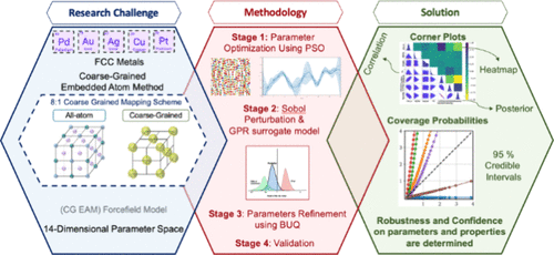 Coarse-grained (CG) molecular dynamics (MD) simulations have emerged as a powerful and cost-effective approach for modeling materials by simplifying atomic structures into CG beads. However, accurately parametrizing interatomic potential models (force fields, FFs) that can reliably reproduce material properties and quantifying the uncertainties associated with both the model parameters and their predictions remains a major challenge. In this study, we developed coarse-grained embedded atom method (CG EAM) potentials to model interatomic interactions in face-centered cubic (FCC) metals, including palladium (Pd), gold (Au), silver (Ag), copper (Cu), and platinum (Pt). The CG EAM potentials combine the physical interpretability of a traditional EAM with the computational efficiency of coarse-graining. We first employed a Particle Swarm Optimization (PSO) framework integrated with CG MD simulations to explore a 14-dimensional parameter space and identify CG EAM parameters that reproduce key physical, mechanical, and thermodynamic properties, such as cohesive energy, lattice constants, and elastic moduli. These parameters were subsequently refined using a Bayesian uncertainty quantification (BUQ) approach, which allowed the systematic assessment of uncertainties in both the FF parameters and the predicted properties. For all five metals, this framework yielded robust parameter ranges within which the predicted properties generally remained within their 95% confidence intervals. Overall, this integrated parameter optimization and BUQ approach provides an effective strategy for developing accurate and reliable interatomic potentials while offering a generalizable framework for designing both hard and soft materials with targeted properties.
