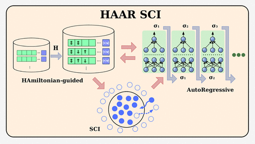 Strongly correlated molecules remain out of reach for most electronic-structure solvers because the exact wave function spans a determinant space that grows exponentially with the number of orbitals. State-of-the-art selected-CI (e.g., CIPSI and HCI) and ML-CI methods mitigate search by exploiting Hamiltonian sparsity and learned prescreening. Nonetheless, in strongly multireference regimes, the excitation-based candidate lists can grow rapidly, which may increase memory and screening costs. We present the Hamiltonian-guided autoregressive selected-configuration interaction (HAAR-SCI), a learn–sample–compress workflow that runs on a single GPU. A gated Transformer samples determinants autoregressively; Gumbel Top-K noise encourages exploration, and GPU min-heap kernels keep only configurations with the largest Hamiltonian couplings. The network is retrained after each expansion, and iterations stop when successive energies differ by ≤1 mHa. Across an 18-molecule benchmark set reaching 116 spin–orbitals, HAAR-SCI attains a mean absolute error of 0.51 mHa while using much fewer determinants than heat-bath CI. It traces the entire N2 dissociation curve within 0.67 mHa and achieves HCI accuracy for the 40-spin-orbital [Fe2S2(SCH3)4]2– cluster with a determinant reduction of 72%, demonstrating its power on systems considered intractable for conventional selected-CI solvers. A final probability-mass pruning compresses typical wave functions by a further 10–50×, retaining <0.01% of the Hilbert space yet still capturing >99.9% of the correlation energy. HAAR-SCI thus offers a compact and truly scalable route to chemical-accuracy quantum chemistry on commodity hardware.