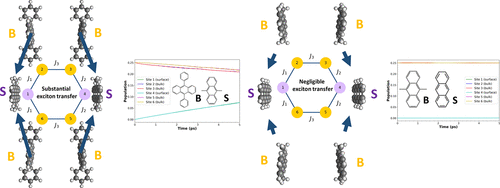 Quantum batteries, which store energy in long-lived excited states, have been theoretically predicted to possess several advantages over conventional classical batteries. While quantum battery research has been predominantly theoretical, preliminary experimental demonstrations have emerged. To advance the field beyond abstract theoretical models, we propose in this work molecular models that bring quantum batteries closer to physical realization. These models consist of anthracene-based chromophores in a hexagonal arrangement. Time-dependent density functional theory calculations confirm the existence of the previously predicted dark states in these models and yield monomeric excitation energies and couplings between the monomeric excited states, which are needed for parametrizing the Frenkel exciton Hamiltonians. Following the parametrizations, exciton dynamics simulations are carried out for all models starting from their respective dark states, under both symmetry-preserving (storage) and symmetry-breaking (discharge) conditions. Both the magnitude and sign of the on-site energy gaps are found to influence the exciton discharge rates, exhibiting a turnover as this gap is varied from large negative to large positive values. Notably, the rate exhibits a maximum when the energy gap is negative, and the turnover behavior is asymmetric about this point, with higher rates for negative gaps. Marcus theory provides a qualitative framework for explaining the trends in the simulated exciton discharge rates as both the sign and magnitude of the energy gap are varied. Overall, this work establishes a computational approach for designing molecular models of quantum batteries, sheds light on the nature of the dark states for exciton storage, and establishes design principles for controlling exciton transfer rates.