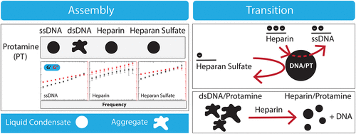 Phase-separated biomolecular condensates play a crucial role in cellular organization. In the nucleus, phase separation regulates the assembly and function of nuclear proteins and the genome. Here, we demonstrate that protamine, an arginine-rich nuclear protein responsible for promoting double-stranded DNA (dsDNA) compaction in sperm, undergoes phase separation with single-stranded DNA (ssDNA) and induces dsDNA aggregation. The protamine-ssDNA condensates behave as viscoelastic liquid droplets and can be modulated by varying salt concentrations or by treatment with heparin, a glycosaminoglycan polyanion, which we show displaces ssDNA. Moreover, protamine-dsDNA aggregates dissolve upon exposure to heparin, leading to the formation of condensates with a distinct morphology. This observation provides a compelling example of an aggregate-to-condensate transition in polyelectrolyte systems. Notably, direct combination of protamine with heparin results in the formation of similar phase-separated liquid-like droplets, suggesting that heparin can compete with both ssDNA and dsDNA for protamine binding. We performed a comparative analysis using other positively charged proteins and negatively charged glycosaminoglycans to gain insights into the condensation behavior of protamine and heparin. Finally, we leveraged these findings to conduct a proof-of-concept analysis aimed at developing programmable biomolecular condensates for protamine-assisted nucleic acid delivery. Given that polyanionic glycosaminoglycans have been used for sperm capacitation and that DNA fragmentation is a biomarker for infertility in males, our findings offer new insights into the mechanisms of protamine-driven DNA compaction in sperm and its potential implications for reproductive medicine.