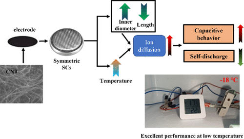 Supercapacitors (SCs) characterized by excellent charge and discharge rates, high power density, and stable cycling performance, exhibit crucial applications in various fields, while it faces significant performance degradation at low temperature. Herein, we systematically investigate the electrochemical performances of carbon nanotube (CNT)-based SCs over a temperature range of −18 to 60 °C and establish quantitative relationships between CNT geometry and temperature-dependent electrochemical kinetics in symmetric SCs. The results and analysis supported by electrochemical impedance spectroscopy (EIS) with Warburg diffusion analysis, Arrhenius modeling of ion diffusion kinetics, and multiterm self-discharge modeling reveal exceptional low-temperature resilience where CNT-based SCs retain >85% peak specific capacitance (75.76 F/g at 0.5 A/g) with 87% rate retention at 20 A/g (−18 °C), attributable to minimized diffusion barriers in CNTs with shorter length and wider channel that reduce Arrhenius activation energy by 33% (CNT-8-L: Q = 15.40 kJ/mol vs CNT-3-L: 23.07 kJ/mol). In addition, a symmetric CNT-based SC is successfully employed to power a digital thermometer. The self-discharge compensation effect enables optimized energy deliver of the CNT-based SC for over 40 min to the digital thermometer at −18 °C (approximately 4 times longer than at 60 °C) through suppression of current leakage as well as ion diffusion, although the specific capacitance is lower. The experimental findings and analyses contribute to the design and optimization of CNT geometries for low-temperature applications and deepen our understanding of the underlying energy storage mechanisms.