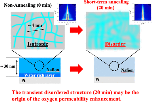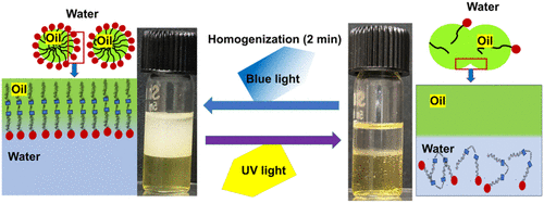 Azobenzene-containing cetyltrimethylammonium bromide (Azo-CTAB) surfactant molecules are originally self-assembled with their head group (red) at the interface of an oil‒water emulsion. Upon UV light illumination, they lose their surface activity and dissolve in the aqueous phase, inducing phase separation of the emulsion. Upon blue (visible) light illumination, the emulsion is reconstructed, suggesting photoswitchability. [Open AI was used to create the background.]