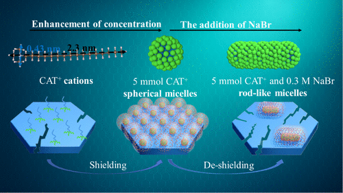 The introduction of a specific concentration of long-chain alkyl quaternary ammonium cations inhibits the construction of mesoporosities inside MFI zeolites through alkaline treatment. The spontaneously formed micelles bear an electrical double-layer structure, which imposes repulsion on the caustic hydroxide ions (OH–) and therefore restrains the dissolution of the zeolite in the alkaline media. The aforementioned inhibitive effect of long-chain alkyl quaternary ammonium cations can be disabled by the addition of an inorganic salt, such as NaBr, which induces a transformation in micelle morphology and the micellar electrical double-layer structure. In the case of alkyl quaternary ammonium cations with short alkyl chains (e.g., trimethyloctylammonium: C8TA+), such an inhibitive effect cannot be eliminated by the addition of an inorganic salt like NaBr. These findings update the understanding of the roles of alkyl quaternary ammonium cations and their micelle forms in tailoring the porosities inside zeolites.