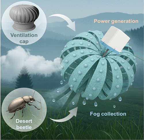 This study aimed to address the global challenges of freshwater scarcity and energy shortage by developing a bioinspired and multifunctional fog collector. Drawing inspiration from the architecture of unpowered ventilation caps and the surface structure of desert beetles, the researchers engineered a three-dimensional device featuring a wettability gradient. This advanced structure featured a 360° array of blades composed of superhydrophobic surfaces and superhydrophilic regions, enabling omnidirectional fog collection while simultaneously utilizing rotational motion to generate electricity. Experimental evaluations demonstrated that the device achieved a fog collection efficiency of 7620 mg cm–2 h–1 under conditions of 2.6 m/s wind speed and 100% relative humidity. Additionally, the system generated a stable electrical output of 0.6 V and 5 mA at a wind speed of 7 mph. The fabrication process involved laser scanning and chemical modification to establish superhydrophobic and superhydrophilic regions, thereby creating a wettability gradient. This configuration, in conjunction with centrifugal forces, facilitated the effective capture and directed transport of water droplets. The device also exhibited robust durability across repeated experimental trials, underscoring its suitability for prolonged use. This work presented a novel design paradigm for fog collection systems and offered promising applications in mitigating both water and energy scarcity.