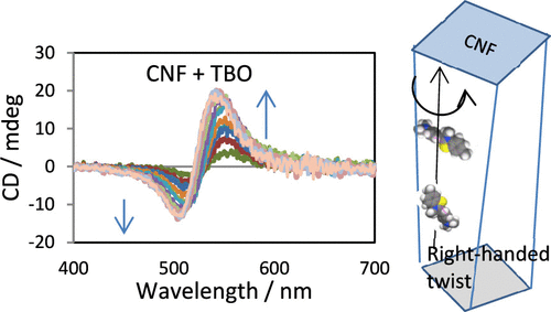 Chiroptical properties of cellulose nanofibers (CNFs), especially optical chirality-inducing abilities, are crucial subjects to be explored for the development of CNF as a new class of optical materials. This study investigated experimentally the induced circular dichroism (CD) of the positively charged achiral dye molecules thioflavin T (ThT), toluidine blue O (TBO), and methylene blue (MB), adsorbed on 2,2,6,6-tetrametylpiperidine (TEMPO)-oxidized CNFs in aqueous suspensions. The achiral dyes exhibited CD spectra of the sigmoidal positive exciton-coupling shape, suggesting the effect of the right-handed helicity of the fiber. The observed CD intensities were proportional to the concentrations of the bound dye molecules. The TBO–CNF systems could be used for a reproducible titration method of the total amount of carboxylate ions on the surface of CNF, which gave a value of 2.0 ± 0.3 mmol/g. The Langmuir isotherm was applicable to the adsorption equilibrium between CNFs and the dye molecules, though a stacking effect was suggested in ThT systems, and a dimerization effect was found in MB systems. Furthermore, it was discovered that sweeping the dye-adsorbed 0.2% CNF suspension by a Cu wire in a 1 mm optical cell induced the positive and negative linear dichroism (LD) spectra of the dye molecules, depending on the vertical and horizontal sweeping directions, respectively. The hydrodynamic orientation of CNFs by the “wire-sweeping” was confirmed by the measurement of the linear birefringence (LB) of CNFs. A comparison between the angular dependences of the LD of the dye and the LB of the CNF in an identical sample suggested that the averaged angle between the electron transition moment of the adsorbed dye molecule and the long axis of the fiber was between 45° and 135°.