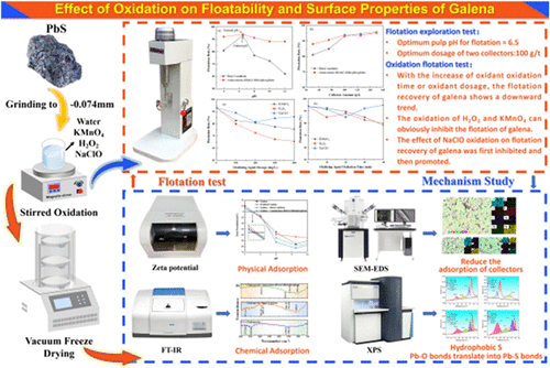 A galena sample from Hunan, China, was selected as the research object. The pH of the pulp and the dosage of the collector were optimized for the flotation of galena, utilizing butyl xanthate and butyl ammonium dibuthyl dithiophosphate as the collectors. The alteration in the floatability of galena was also examined post-oxidation in different solutions. The influence mechanism of oxidation on the surface properties of galena was studied using a range of analytical techniques, including contact angle measurement, Fourier transform infrared spectroscopy (FT-IR) analysis, ζ potential detection, X-ray photoelectron spectroscopy (XPS) analysis, and scanning electron microscopy with energy dispersive X-ray spectroscopy (SEM-EDS) analysis. The galena recovery is found to decrease in proportion to both an increase in oxidation time and an increase in oxidant concentration. Oxidation exerts a greater detrimental impact on recovery when butyl xanthate is used compared to ammonium dibutyl dithiophosphate. Contact angle and FT-IR analyses and ζ potential indicate that intensified oxidation suppresses the natural floatability of galena and that chemical adsorption and a weak physical adsorption interaction occur between galena and both collectors. XPS analysis demonstrates that oxidation increases the content of high-valence sulfur species and generates elemental sulfur during the oxidation process. SEM-EDS analysis indicates that oxidation diminishes the adsorption of both collectors on the galena surface. These findings provide theoretical insights into the effects of oxidation on galena floatability and surface characteristics, thereby offering support for the flotation separation technology of oxidized sulfide minerals.