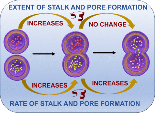 Enveloped viruses enter the cell through the fusion of the viral envelope with the host membrane. These viruses either fuse at the plasma membrane or the endosome after entering the cell through endocytosis. Severe acute respiratory syndrome coronaviruses (SARS-CoVs) fuse at the plasma membrane by harnessing the capability of the spike (S) protein to fuse membranes. The binding of the S1 subunit to angiotensin-converting enzyme 2 (ACE2), the cell surface receptor, leads to the proteolytic cleavage at the S2′ site, which exposes the N-terminal fusion peptide (FP) and induces fusion. In this work, we have evaluated the effect of the conserved fusion peptide sequence of SARS-CoVs (FP) in polyethylene glycol (PEG)-induced fusion of small unilamellar vesicles (SUVs) in different lipid compositions. The analysis of kinetic data of fusion observables such as lipid mixing (LM), content mixing (CM), and content leakage (CL) in a one-intermediate fusion model provides a detailed insight into the mechanistic role of FP in membrane fusion. We have further shown that the peptide binding does not alter the hydrodynamic diameters, ζ and dipole potentials of membranes with varying lipid composition. To understand the plausible role of FP in inducing membrane fusion, we have examined the effect of peptide binding on the depth-dependent membrane ordering and polarity using steady-state and time-resolved fluorescence spectroscopy. Evaluation of kinetic data reveals that the FP promotes the rate constant of pore formation without affecting its extent, making the fusion reaction kinetically favorable. Overall, our work provides a mechanistic understanding of the role of the conserved fusion peptide sequence of SARS-CoVs in membrane fusion.