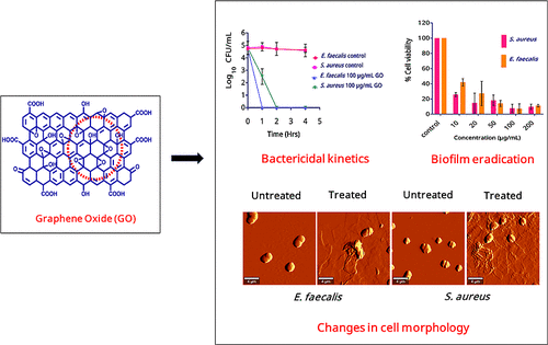 The global rise of antimicrobial resistance (AMR) underscores the urgent need for novel antibacterial agents, particularly those based on two-dimensional (2D) nanomaterials, such as graphene oxide (GO). In this study, GO was synthesized from graphite using an improved Hummer’s method optimized for scalability, safety, and environmental sustainability. The protocol eliminates hazardous sodium nitrate and substitutes highly corrosive sulfuric acid with milder phosphoric acid, which serves dual roles as an oxidizing and intercalating agent. This facilitates edge and surface etching, resulting in an oxo-functionalized GO with high aqueous stability and uniform dispersion. The antibacterial efficacy of the synthesized GO was evaluated against two Gram-positive bacteria, Enterococcus faecalis (ATCC 29212) and Staphylococcus aureus (ATCC 29213). The concentration and time-dependent killing efficacy of GO demonstrated the rapid killing of 5 log10 CFU/mL bacterial cells at 200 μg/mL within 1 h. The biofilm eradication potential of GO was explored, where ∼92% reduction in biofilm cell viability was noted at 100 μg/mL against both bacteria. The oxidative stress induction was assessed by Ellman’s assay, and a concentration-dependent loss of glutathione was noted up to 36.01% at 200 μg/mL. The membrane permeabilization ability was analyzed by the propidium iodide (PI) uptake assay, where significant permeabilization was observed at 50 μg/mL or higher. The antibacterial mechanisms were further corroborated by atomic force microscopy and scanning electron microscopy, which revealed the morphological distortions attributed by the nanoknife-like edges of GO. The hemolytic assay against mice red blood cells indicated minimum to negligible toxicity of GO when tested up to 400 μg/mL, confirming its safety toward mammalian cells. Overall, these findings reinforce the potential of this safely synthesized GO as a multifunctional nanomaterial with significant potential for biomedical applications like antimicrobial coatings and wound dressings and for environmental applications including water purification and disinfection.