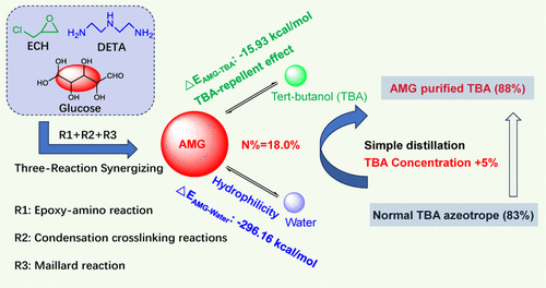 The development of aminated polysaccharide materials is often hampered by a low amine grafting efficiency and high energy consumption. Herein, we report a novel one-pot precipitation polymerization strategy for the facile and scalable synthesis of amine-modified glucose (AMG) by synergistically integrating three distinct reactions: the epoxy-amine addition for oligomer formation, the condensation cross-linking for constructing robust networks, and the Maillard reaction for dramatically enhancing amine grafting sites. This synergistic approach enables a high nitrogen content (18.0%) and a positive surface charge (+31.3 mV) in the resulting AMG. More importantly, the AMG exhibits a unique “hydrophilic and tert-butanol (TBA)-repellent” effect, which is mechanistically unraveled by a significant disparity in binding energy with water (−296.16 kcal/mol) versus TBA (−15.93 kcal/mol), as confirmed by molecular dynamics simulations. Through this effect, AMG successfully breaks the water-TBA azeotropic equilibrium that has been unreported, increasing the TBA concentration by 5% from that of its azeotrope via a simple distillation process. Furthermore, the obtained AMG demonstrates excellent and selective adsorption capacity for anionic dyes. This work provides a novel strategy for designing functional amino polysaccharides and develops a new technology for TBA azeotrope separation.