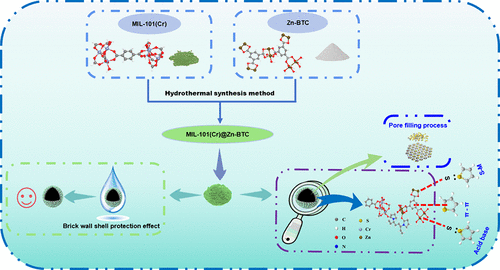 Owing to their uniform microporous structure, monometallic MOFs often suffer from an inherent trade-off between mass transfer resistance and adsorption capacity, making it challenging to integrate both high adsorption kinetics and large capacity within a single adsorbent. To address this issue, this study proposes a MOF@MOF design strategy based on the coupling of bimetallic synergy and hierarchical porosity effects, through which a (MIL-101(Cr))@(Zn-BTC) composite with a well-defined “micro–meso–macroporous” hierarchical architecture is successfully constructed. Batch adsorption experiments demonstrate that the composite achieves a high saturated adsorption capacity of 161 mg/g for thiophene sulfur (Thiophene-S) under ambient temperature and pressure. The adsorption kinetics follow the pseudo-second-order model, and the isotherm data are well fitted by the Freundlich equation, suggesting a multilayer adsorption mechanism. Notably, owing to the macroporous cavity structure of Zn-BTC, the composite exhibits significantly enhanced diffusion kinetics─within the same adsorption period, its adsorption capacity reaches twice that of pure MIL-101(Cr). Moreover, the material effectively retains its adsorption performance even after water treatment, alleviating the capacity attenuation commonly observed in conventional MOFs under aqueous conditions. Mechanistic studies reveal that the high desulfurization performance of (MIL-101(Cr))@(Zn-BTC) stems from the synergistic contributions of high specific surface area, metal–sulfur coordination, π–π interactions, and acid–base cooperative effects. Further insights from DFT calculations and XPS characterization indicate that the bimetallic synergy significantly narrows the HOMO–LUMO energy gap, thereby reducing the adsorption activation energy, while XPS confirms electron transfer from sulfur atoms in Thiophene-S to metal centers. This study provides a theoretical foundation and a material design strategy for developing bimetallic hierarchical porous adsorbents for desulfurization.