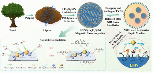 The development of green, efficient, and sustainable noble metal nanocatalysts is critical for addressing industrial wastewater pollution. Herein, we report a high-value utilization strategy for agricultural waste biomass by transforming lignin nanoparticles (LNPs) derived from agricultural residues into multifunctional supports for Fe3O4 and Pd nanoparticles. Through a two-step process─antisolvent self-assembly followed by in situ reduction─LNPs@Fe3O4@Pd magnetic nanocomposites are synthesized, combining lignin’s inherent eco-friendly properties with the magnetic recyclability of Fe3O4 and the catalytic activity of Pd. The catalytic study showed that LNPs@Fe3O4@Pd presented excellent catalytic efficiency for the fade of methylene blue (catalytic rate constant is 5.89 min–1). The incorporation of stable superparamagnetism imparted the LNPs@Fe3O4@Pd with an exceptional cycling performance. Additionally, the nanocomposites exhibit robust photothermal conversion capabilities, enabling the construction of NIR laser-responsive liquid marbles via simple assembly. These liquid marbles combine magnetic separability and light-triggered controllability, offering a dynamic and reusable platform for dye wastewater treatment. Consequently, LNPs@Fe3O4@Pd and their liquid marble assemblies hold significant potential for industrial-scale applications in sustainable dye removal and beyond.