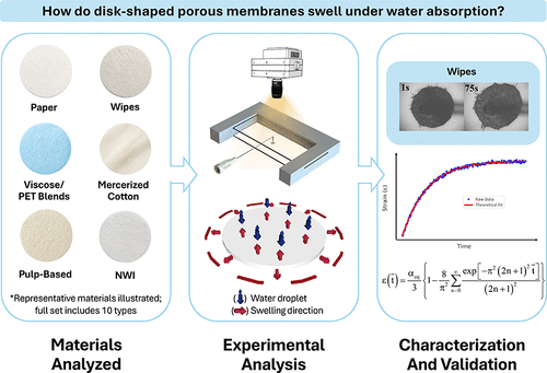 Understanding the swelling behavior of porous membranes in the presence of wetting liquids is essential for optimizing performance in applications ranging from industrial fabrics to healthcare textiles. Here, a combined experimental and theoretical approach is used to explore water imbibition and swelling and to quantify it in terms of two physical parameters: the equilibrium swelling coefficient (αeq) and the transport coefficient (D). Unlike traditional approaches that focus solely on absorption measurements, the present method directly links the theory of swelling dynamics with experimental data. A diverse set of ten different materials, including paper, dry wipes, healthcare-grade nonwovens, industrial fabrics, and mercerized cotton, was evaluated using high-resolution imaging to track disk swelling. A nonlinear least-squares (NLS) method was employed to extract the physical parameter values (αeq and D) from the experimental data. The results reveal not only excellent agreement between the theory and experiment but also provide a novel direct, quantitative comparison of diverse water-imbibing and swelling materials, with dry wipes exhibiting the highest swelling and mercerized cotton the lowest. The findings are particularly relevant for industries that rely on controlled fluid uptake, such as hygiene products, medical dressings, and absorbent substrates.