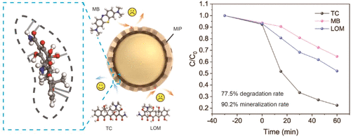 Herein, a molecularly imprinted TiO2 photocatalyst (T@MIP) was designed for the targeted degradation of tetracycline by combining flame spray pyrolysis with surface molecular imprinting technology. The FSP-derived TiO2 substrate, rich in surface defects and hydroxyl groups, serves as a key anchor for the subsequent prepolymerization of specific molecularly imprinted sites. The T@MIP catalyst exhibits excellent overall performance, including high selectivity for TC in a multipollutant system, exceptional degradation efficiency, and near-complete mineralization. Notably, mechanistic studies using free-radical EPR and in situ DRIFTS revealed that the molecularly imprinted sites simultaneously enrich TC molecules, leading to synergistic degradation dominated by ·O2– and h+. This work establishes a new model for the development of “smart” photocatalytic systems for precision environmental remediation.