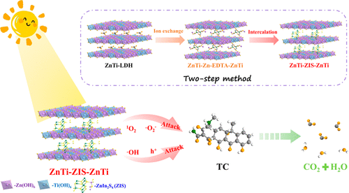 Exploration of high-performance photocatalysts is crucial for photocatalytic antibiotic degradation. Herein, the 2D ZnTi layered double hydroxide intercalated with 2D ZnIn2S4 nanosheets (denoted as ZnTi-ZIS-ZnTi) is synthesized by utilizing the ion exchange and intercalation strategies. Experimental results demonstrate that the 2D/2D ZnTi-ZIS-ZnTi heterostructure exhibits excellent photocatalytic degradation activity for tetracycline, achieving a degradation rate of 94.68% within 60 min of visible light irradiation, as well as unexpected recyclability after eight consecutive cycles under different water quality conditions. Mechanism investigation demonstrates that two main active species (h+ and 1O2) are involved in TC degradation. The outstanding photocatalytic performance can be attributed to the formation of Type-II heterojunction with intimate contact, which is achieved through the intercalation strategy. Specifically, the intercalation strategy results in a multilamellar hierarchical morphology, enhances the separation efficiency of photogenerated carriers, promotes electron transport, and provides plenty of active sites for the photocatalytic process. This work identifies a promising photocatalyst system for water purification.