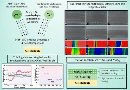 To investigate the regulatory mechanism of the composition ratio of silicon carbide (SiC) and molybdenum disulfide (MoS2) composite coatings on the tribological properties of silicon substrates, a series of composite films were fabricated via magnetron sputtering technology. A rotational friction test was conducted to measure the tribological properties, and it was found that the average friction coefficient (ACOF) (3 samples in total) monotonically decreased from 0.124 ± 0.007 to 0.082 ± 0.004 with increasing MoS2 content. However, the friction coefficient increased with the absence of the SiC interlayer (S6), indicating that there was an optimal sputtering ratio between MoS2 and SiC (the ACOF of S5 decreased by 33% compared to that of S1). Combined with an analysis of the composition ratios, the synergistic mechanism between the wear-resistant enhancement effect of SiC and the solid lubrication effect of MoS2 was investigated. A composite film system with a continuous gradient change in SiC and MoS2 sputtering time was innovatively constructed, establishing a quantitative model to provide insights into the synergistic lubrication mechanism of multicomponent materials. Moreover, the findings can facilitate understanding of the composition design and mechanism studies of lubricating wear-resistant films on silicon-based device surfaces.