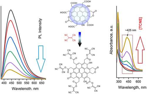 The interaction of photoluminescent carbon nanodots (CDs) with their environment underpins a fundamental factor in the design of photoluminescent CDs for various potential applications. The effect of synthesis reaction temperature on photophysical features and quenching behavior using one of the strongest electron acceptors, tetracyanoethylene (TCNE), was systematically investigated. Thorough characterization confirmed progressive carbonization and formation of sp2-hybridized carbon cores with temperature, alongside a reduction in surface oxygenated groups. Optical absorption and emission spectrum revealed the transition from surface-dominated to core-dominated emission mechanisms with temperature. Upon quenching analysis with TCNE, all CDs exhibited PL quenching and a characteristic absorption band formation at 420 nm, corresponding to the new CD-TCNE adduct formation. The quenching shows the positive deviation from the Stern–Volmer equation with a large quenching extent that follows the order CD-180 > CD-200 > CD-150. The mechanism was found to be induced by a combination of static and dynamic mechanisms, affected by the interplay within edge-functionalized groups and π-conjugated aromatic domains and their intrinsic adduct formation with TCNE. The static quenching components related to the CD-TCNE adduct formation were estimated using the quenching sphere of action model with the values of sphere volumes, V, and the sphere diameters in the order of CD-180 (4.1 nm) > CD-200 (3.8 nm) > CD-150 (3.5 nm). These results demonstrate that the reaction temperature critically modulates the size, electronic structure, and quenching dynamics of CDs with TCNE, facilitating control upon excited-state behavior for optoelectronic and sensing applications.