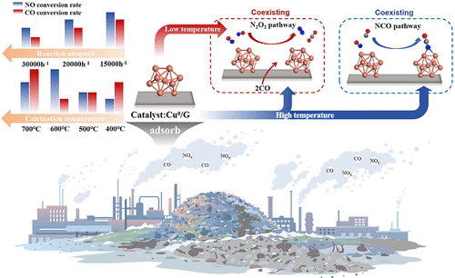 Efficient transition-metal-based catalysts for low-temperature NO reduction remain a significant challenge. In this study, an efficient, highly dispersed zero-valent copper (Cu0) supported on activated carbon catalyst was prepared, exhibiting high NO reduction performance at 200 °C, with 80% NO conversion and 100% N2 selectivity. The calcination temperature plays a crucial role in determining the composition and dispersion of catalysts, which subsequently affects their catalytic performance in NO reduction. At lower calcination temperatures, incomplete reduction of the active components results in a reduced catalytic activity. Conversely, higher calcination temperatures lead to catalyst agglomeration, increasing the level of CO adsorption on the catalyst surface, which subsequently inhibits the NO reduction. When the reaction temperature is over 300 °C and the O2/CO ratio is ≤0.5, the activity of the Cu-BAC-500 catalyst for NO reduction by CO is scarcely affected by O2. The reaction temperature alters the NO reduction mechanism. The reaction mechanism in this study was primarily simulated under oxygen-free conditions. At lower temperatures, the mechanism involves the coadsorption of NO, which decomposes to form N2O. This N2O is then directly reduced by CO to produce N2. When the reaction temperature is above 300 °C, in addition to the aforementioned pathway, a new route emerges where adsorbed NO is directly reduced by CO to generate CO2 and surface-active N* species. These N* species then adsorb NO, forming N2O, which is further reduced by CO to form N2. This study presents novel copper-based catalysts and offers a strategy for efficient low-temperature NO reduction.