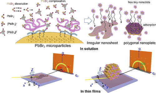We report the formation of hybrid hairy nanostructures composed of polystyrene-block-poly(ethylene oxide) (PS-b-PEO) and lead bromide (PbBr2) complexes in 1,3,5-trimethylbenzene (TMB). In this system, TMB acts as a selective solvent (good for the PS block and bad for the PEO block) while serving as a nonsolvent for PbBr2. Although PbBr2 is insoluble in neat TMB, its complexation with PS-b-PEO promotes the formation of the [PbBr3]− and [PbBr4]2– complexes. These complexes coordinate with the ether groups of the PEO block, forming host–guest interactions that drive the inclusion crystallization of two-dimensional (2D) hybrid nanostructures, including irregular nanosheets and polygonal nanoplates. The morphology of these nanostructures strongly depends on the PS-b-PEO/PbBr2 weight ratio. Higher ratios (20/100 and 20/200) favor irregular nanosheets, while lower ratios (20/10) favor polygonal nanoplates. Structural analysis reveals that the irregular nanosheets adopt an orthorhombic Cmca lattice (a = 23.53 Å, b = 4.20 Å, c = 33.22 Å), whereas the polygonal nanoplates exhibit a hexagonal P6mm lattice (ahex = 13.954 Å, γ = 120°). Both types of 2D structures are decorated with ultrasmall PbBr2 nanoparticles encapsulated by PS-b-PEO chains. The PEO blocks coordinate to nanoparticle surfaces, while PS blocks swell in the TMB. This synergistic process integrates PbBr2 complexation, host–guest coordination, inclusion crystallization, and block copolymer-mediated nanoparticle assembly. In spin-coated films, polygonal nanoplates preferentially adopt edge-on orientations, while irregular nanosheets lie flat-on. These findings offer insights into block copolymer templating of 2D organic–inorganic hybrid nanostructures.