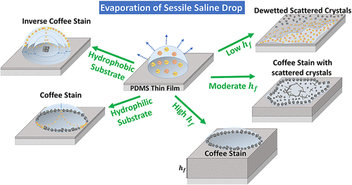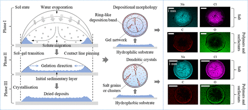 The evaporation and deposition of respiratory sessile droplets play a critical role in the transmission of infectious pathogens. This study investigated the drying behavior of surrogate respiratory fluids containing salts, polymers, and surfactants, with a focus on the impact of substrate wettability and solute effects on evaporation kinetics and deposition patterns. First-order statistics (FOS) and gray level co-occurrence matrices (GLCM) were employed to quantify the texture features of the dried deposits. The results demonstrated that droplets evaporated in constant contact radius (CCR) mode on ordinary glass, polydimethylsiloxane (PDMS), and nanocoated surfaces, yet crystalline nucleation and final deposit morphology varied markedly. Hydrophilic substrates induced intracrystal ring nucleation, forming a composite morphology comprising a ring-like deposition band (edge), a gel network, and dendrite clusters (center). In contrast, hydrophobic substrates promoted crystal nucleation near the triple-phase contact line (TPCL). Higher hydrophobicity widened the ring-like deposition band from 0.1 (glass) to 0.22 (nanocoated surface) and increased deposit complexity, evidenced by a drop in mean gray value (143 to 108) and a rise in entropy (6.9 to 8.1). Surfactants enhanced spreading and stabilized contact line pinning by reducing surface tension, thereby driving polymer migration toward the TPCL, where they self-assembled into ring-like gel networks. Salt ions induced polymer aggregation and phase separation via electrostatic interactions and cooperated with surfactants to suppress the coffee-ring effect. Moreover, increasing salt concentrations shifted crystal morphology from needlelike to dendritic and eventually petal-like, producing a “dense edge – sparse center” distribution with greater textural complexity. Conversely, higher polymer concentrations led to reversed amorphization of deposit morphology and nonmonotonic textural evolution.