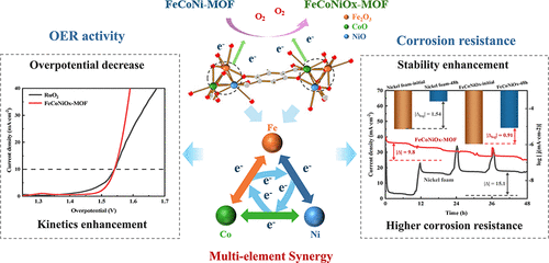 Metal-organic framework (MOF) materials have been widely used for water electrolysis with their high-quality structural features and many active sites, while the corrosion resistance of the industrial oxygen evolution reaction (OER) anode is a significant challenge in water electrolysis for hydrogen production. We prepared a series of MOF materials (FeOx-MOF, CoOx-MOF, NiOx-MOF, FeNiOx-MOF, FeCoOx-MOF, CoNiOx-MOF, and FeCoNiOx-MOF) by doping transition metals Fe, Co, and Ni as polymetallic elements. As an OER catalyst, FeCoNiOx-MOF exhibits the best electrocatalytic activity with an overpotential of 290 mV at 10 mA cm–2 current density among all the materials. It exhibits superior catalytic activity compared to RuO2. In addition, the current density and stability of FeCoNiOx-MOF are superior to those of CoNiOx-MOF and CoOx-MOF under the same constant potential (1.57 V vs RHE) conditions. Within 48 h, the corrosion current density change of FeCoNiOx-MOF (15.0%) was significantly lower than that of industrial-grade nickel foam (30.0%) in the same group, indicating a significant improvement in corrosion resistance, which may be attributed to the synergistic effect of multiple elements in FeCoNiOx-MOF. This study prepared a multielement FeCoNiOx-MOF with enhanced OER activity and corrosion resistance, providing a partial theoretical basis for its industrial applications.