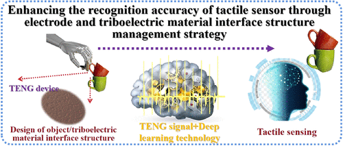 Triboelectric nanogenerators (TENGs) produce distinct electrical signals upon contact with different objects, enabling their application in tactile sensors for material identification. Current strategies to improve identification accuracy primarily focus on sensor structure, operating mode, and material composition. Here, we introduce an interface strain management strategy to enhance both output performance and recognition accuracy. The proposed TENG device comprises two key components: a copper sheet electrode and a polydimethylsiloxane (PDMS) triboelectric layer with different elastic modulus. Interestingly, the device’s output performance does not increase monotonically with enhanced strain capacity. Instead, it exhibits an initial rise followed by saturation and eventual decline. This behavior is attributed to the formation of a high-viscosity surface at elevated PDMS curing ratios, which introduces interfacial adhesion that reduces effective contact stress during the contact-separation cycle. Therefore, optimizing the PDMS curing ratio is essential to balance interfacial strain and surface viscosity, thereby maximizing output performance. Leveraging machine learning, the system achieved a material identification accuracy of 98.6% using a convolutional neural network trained on triboelectric signal features under ambient conditions. Furthermore, an integrated material recognition platform was developed, incorporating the TENG-based sensor, data processing, and display modules, capable of real-time signal acquisition and interpretation. This work offers a promising approach for advancing material perception technologies toward intelligent machine applications.