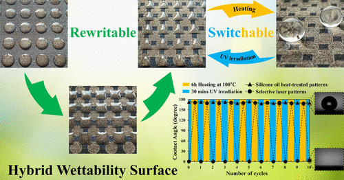 Nature-inspired surfaces with hybrid wettability hold significant promise for water harvesting, dropwise condensation, and biomedical liquid arrays. However, current fabrication methods are hampered by restricted pattern complexity, reliance on toxic fluorides, mask alignment inaccuracies, and poor scalability. Here, we introduce a fluorine- and mask-free, implant-grade process to create superhydrophilic–superhydrophobic (SHPi–SHPo) patterns on titanium via sequential laser machining, silicone oil heat treatment, and ultraviolet (UV) irradiation treatment. Through parametric optimization of laser parameters and UV exposure, we establish ideal fabrication conditions for achieving micron-scale accuracy, enhanced stability in SHPi micropatterns, and long-term durability of the SHPo substrate. The underlying mechanisms governing wettability transitions and stability were elucidated through surface morphology and surface chemistry analyses. Additionally, the SHPi regions within hybrid architectures exhibit switching between extreme wettability states (SHPi and SHPo) via UV irradiation and thermal annealing cycles while maintaining adjacent SHPo regions’ integrity without cross-contamination. Moreover, additional silicone oil heat treatment fully erases prior patterns and enables micron-scale rewriting of arbitrary designs. This scalable, eco-friendly fabrication strategy opens new avenues for dynamic fluid management, efficient heat transfer, and reconfigurable biomedical interfaces.