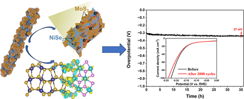 Constructing a heterojunction structure by combining two distinct two-dimensional materials with complementary properties represents a promising yet challenging approach to enhance the hydrogen evolution reaction (HER) in water electrolysis. So far, phase engineering has been extensively investigated and represents a highly effective strategy for enhancing the catalytic activity of non-noble-metal materials in various catalytic applications. This study demonstrates an in situ phase engineering strategy for MoS2, where the metallic 1T-phase is synergistically enhanced through heterointerface coupling with NiSe. In addition, by further integrating density functional theory calculations, we elucidated the interfacial charge transfer dynamics governing the enhanced HER at the MoS2–NiSe2 heterointerface. The optimized MoS2@NiSe2/CC-2 electrocatalyst demonstrated exceptional performance metrics, requiring merely 98 mV overpotential to deliver a 10 mA cm–2 current density, coupled with a favorable Tafel slope of 91 mV dec–1. These findings establish a universal design principle for engineering high-efficiency HER electrocatalysts through precise interface modulation.