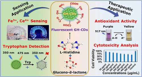 Development of sustainable and multifunctional nanomaterials is essential for advancing environmentally benign technologies in sensing and biomedical applications. Herein, hydrothermal-based one-pot synthesis of carbon dots (GH-CDs) using glucono-d-lactone (GDL) and L-histidine is reported. The GH-CDs exhibit cyan-blue fluorescence and excellent aqueous dispersibility with abundant surface functionalities, as confirmed using UV–vis, fluorescence spectroscopy, HR-TEM, SAED, pXRD, XPS, FT-IR, TGA, and zeta potential measurements. These natural-source-derived CDs exhibited selective detection of Fe3+ and Ce4+ ions mainly due to static interaction and surface complexation, which was confirmed using fluorescence quenching mechanistic analysis. Specifically, GH-CDs demonstrated excellent LOD values of 0.0514 and 0.034 μM for Fe3+ and Ce4+ ions, respectively. The real-time validation of this selective metal ion detection was performed in real water samples, which confirmed the operational robustness and interference resistance of GH-CDs. Additionally, the GH-CDs demonstrated exceptionally high specificity for tryptophan compared to all other natural amino acids. Further, the multifunctional nanoprobe analysis of GH-CDs was extended for evaluating their antioxidant activity using a DPPH assay. This analysis revealed a concentration-dependent radical scavenging efficiency of GH-CDs with 73.2% inhibition at 500 μg/mL and an IC50 value of 86.6 μg/mL. The cytotoxicity analysis followed by cellular imaging studies using the normal HEK cell line further demonstrated the high biocompatibility and fluorescence imaging potential of GH-CDs. The reported versatile applications of GH-CDs make them a sustainable, cost-effective, and efficient nanoprobe material for future use.