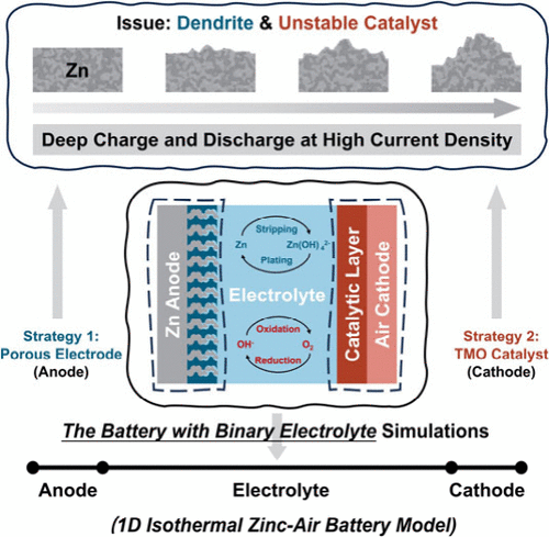 The formation of zinc dendrites under high current density charging/discharging is one of the key issues hindering the use of zinc–air batteries as fast-charging/discharging power batteries. In this study, a Ni foam-loaded Zn anode was strategically designed and integrated with a corrosion-resistant Ni-doped Co3O4 cathode catalyst to build a Zn-NF60|CoNiO cell. The cell achieves an unprecedented operating cycle life of over 160 h at 50 mA cm–2, an 8-fold extension over Zn|CoNiO. This study reveals the positive effects of the porous electrode strategy in optimizing the zinc plating and stripping process, providing new insights on addressing the issue of the continuous Zn anode epitaxial growth under high current density.