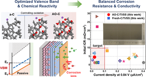 A nanoscale controllable oxidized amorphous carbon layer designed on the C/Ti coating via oxidizing engineering is confirmed to allow for passing electrons while repelling corrosive ions, attributed to reduced adsorption energy and optimized valence band structure. This approach achieves the balanced corrosion resistance and electronic conductivity.
