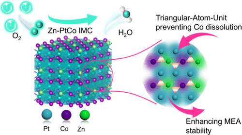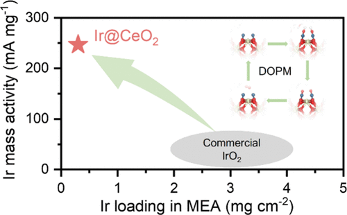 Developing cost-effective low-iridium catalysts for the acidic oxygen evolution reaction (OER) is essential for the advancement of proton exchange membrane (PEM) water electrolyzers. Here, we report a cerium oxide-supported iridium cluster catalyst (Ir@CeO2) that features ultrafine Ir clusters dispersed within a CeO2 matrix, achieving low noble metal loading and favorable activity–stability balance. The Ir@CeO2 exhibits a small overpotential of 197 mV at 10 mA cm–2 and a large mass activity of 247 A gIr–1 at 300 mV, surpassing commercial IrO2 by more than 38 times. The enhanced OER kinetics is attributed to the dual-site oxide pathway mechanism enabled by increased Ir–O covalency and a shortened Ir–Ir distance at chelation interfaces within Ir@CeO2. Utilizing the Ir@CeO2 catalyst in an actual PEM electrolyzer with a minimal Ir loading of 0.3 mg cm–1 demonstrated durable water electrolysis for over 1000 h at a current density of 1 A cm–2 under a cell voltage of 1.68 V.