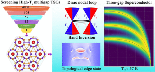 Realizing topological superconductors (TSCs) with high transition temperatures (high-Tc) remains a central challenge in the development of fault-tolerant quantum computation. Here, we propose a route for realizing high-Tc TSCs by integrating multigap superconductivity with nontrivial band topology in lithium-doped bilayer borophene. Extensive structural searches and high-throughput screening of over 4000 Li1–xBx nanosheets identify eight promising multigap TSC candidates. Among them, the LiB12 nanosheet is identified as a prototypical three-gap superconductor and simultaneously a topological metal with a symmetry-protected Dirac nodal loop. Fully anisotropic Migdal–Eliashberg calculations reveal cooperative couplings between σ↔in-plane and π↔out-of-plane phonon, which markedly enhance electron–phonon interactions and drive a high-Tc of 57 K. These findings underscore the potential of metal-doped bilayer borophenes as a cutting-edge material platform for achieving high-Tc multigap TSCs.