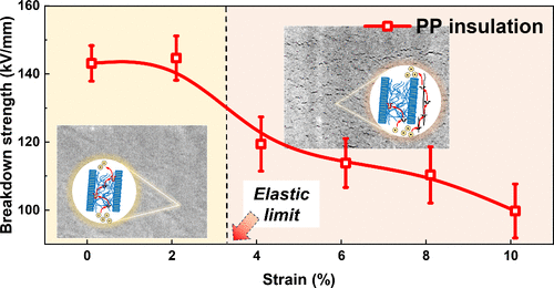 It is commonly acknowledged that the electrical properties of polymer dielectrics remain stable before yielding. However, in this Letter, an abrupt 17.4% decline in the electrical breakdown strength was observed at 4% tensile strain in polypropylene (PP) insulation, which is far below its yielding strain (εy, 16%). In situ scanning electron microscopy was conducted, and microvoids were unexpectedly found, forming at 4% strain, which is inconsistent with the understanding that cavitation only happens near εy. The microvoids lead to higher free volume, increased carrier mobility, and the abrupt decline in the breakdown strength. Furthermore, such critical strain was identified as the elastic limit strain (εe, 3.5%). On that basis, PP samples with suppressed yields and higher εe (5.4%) were prepared with more elastomers. Only a 5.1% decrease in the breakdown strength was observed at 6% strain. This work reveals that suppressing yield and increasing εe can improve the electrical performance stability of semicrystalline dielectrics under mechanical stress.