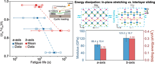 Two-dimensional (2D) materials with intrinsic anisotropy offer unique opportunities for direction-dependent functionality, yet their mechanical anisotropy and long-term reliability remain largely unexplored. Here, we systematically investigate the layered magnetic semiconductor CrSBr, revealing strong in-plane elastic anisotropy (Ea/Eb = 1.43) from angle-resolved atomic force microscopy (AFM) nanoindentation and an out-of-plane modulus of ∼54 GPa from contact resonance AFM, indicative of robust interlayer coupling. Dynamic AFM loading demonstrates pronounced anisotropic fatigue, with superior endurance along the b-axis attributed to enhanced interlayer energy dissipation, consistent with friction measurements and first-principles calculations of interlayer sliding energy. Remarkably, despite its lower fracture strength, CrSBr exhibits fatigue lifetimes comparable to graphene and CVD-grown MoS2 under normalized stress. These results establish CrSBr as a mechanically robust 2D magnetic semiconductor, where anisotropic bonding and interlayer coupling combined govern cyclic damage resistance.