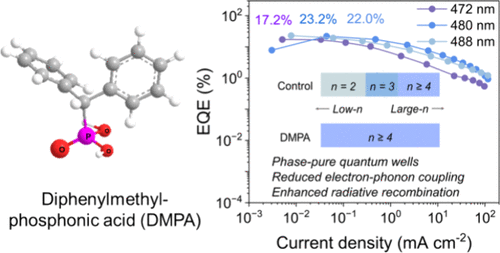 Quasi-two-dimensional (quasi-2D) layered perovskites are widely employed in blue perovskite light-emitting diodes (PeLEDs) due to their ability to modulate energy transfer processes. However, the disordered stacking of inorganic and organic layers in the perovskite film forms multiple quantum well (QW) structures with irregular well-width distributions, leading to severe nonradiative recombination and limiting device efficiency. Here, we develop a synergistic bonding strategy in which the incorporation of diphenylmethylphosphonic acid (DMPA) facilitates the formation of coordination bonds (P–O–Pb) with the inorganic framework and hydrogen bonds (O···H–N) with the organic spacers. These interactions enable the formation of perovskite films with well-regulated QW distributions. Additionally, DMPA induces an upward shift in the perovskite energy level, thereby reducing the hole-injection barrier within the device. As a result, we achieve efficient blue PeLEDs with peak external quantum efficiencies of 23.2%, 22.0%, and 17.2% at emission wavelengths of 488, 480, and 472 nm, respectively.